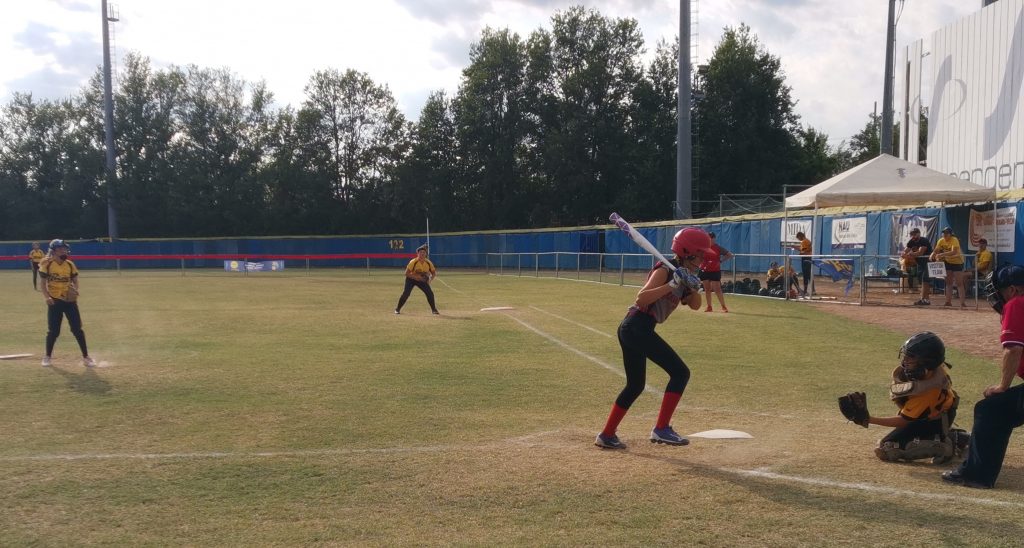 Llegamos a la tercera entrada: Navarra consigue poner en base a una corredora con un precioso hit de toque, y la siguiente bateadora conecta un hit largo que impulsa la primera carrera para Navarra, algo que no se veía fácil. 1-0 para Navarra, que competía con coraje pese al fuerte calor del mediodía…