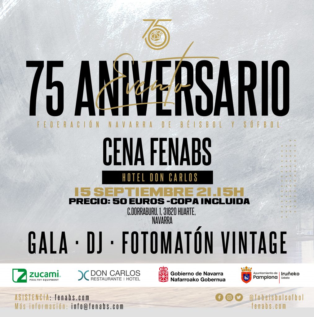 El próximo viernes 15 de septiembre, en el Hotel Don Carlos (Huarte Pamplona), celebraremos el 75 Aniversario de la Federación Navarra con una cena de gala que espera reunir a todos los amigos y amigas de nuestro béisbol y sófbol, tanto de las primeras etapas como de las actuales.